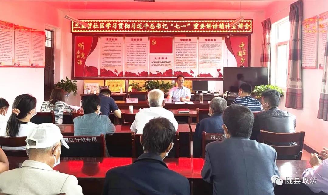 8月12日,陇县县委常委、政法委书记梁治军深入曹家湾镇三里营社区宣讲习近平总书记“七一”重要讲话精神,与基层党员干部重温党史,交流分享学习心得体会。三里营村党员干部等50余人参加了宣讲会。