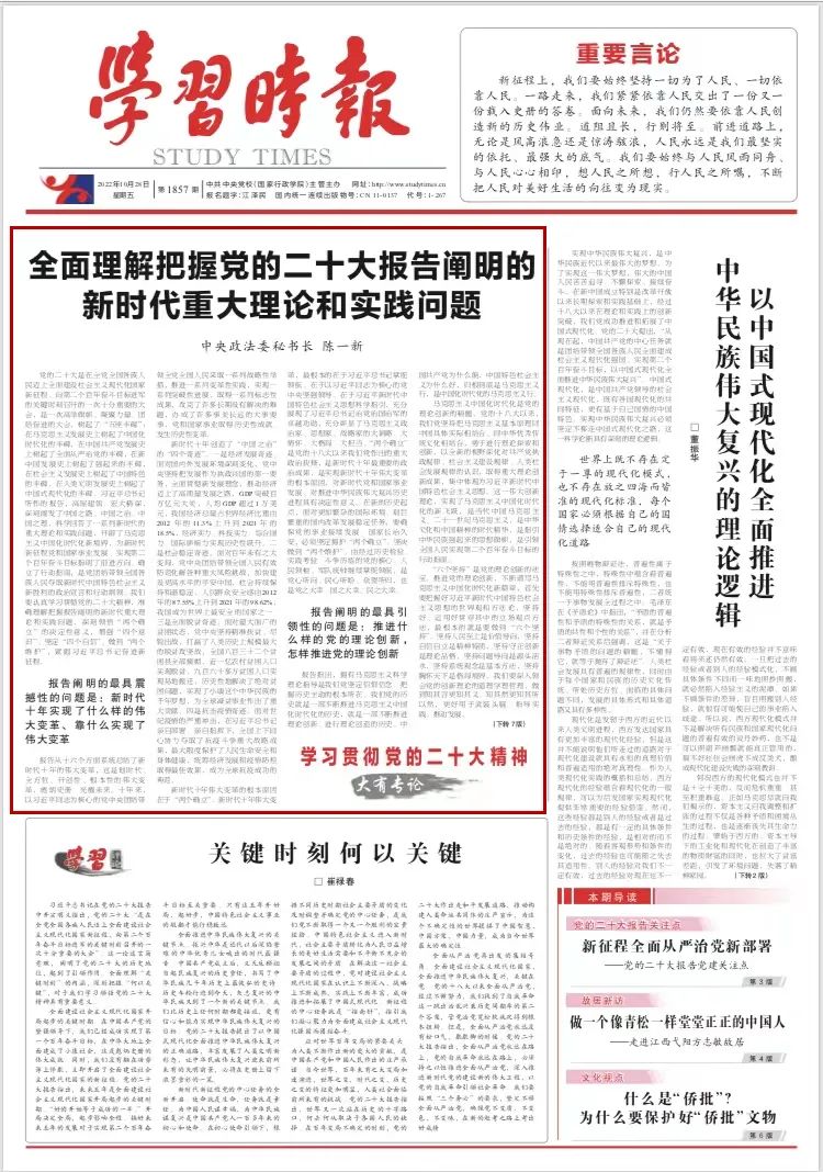 陈一新在学习时报发表署名文章:全面理解把握党的二十大报告阐明的新时代重大理论和实践问题 |