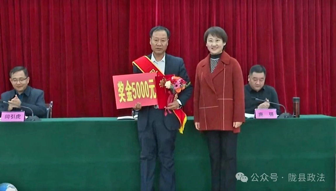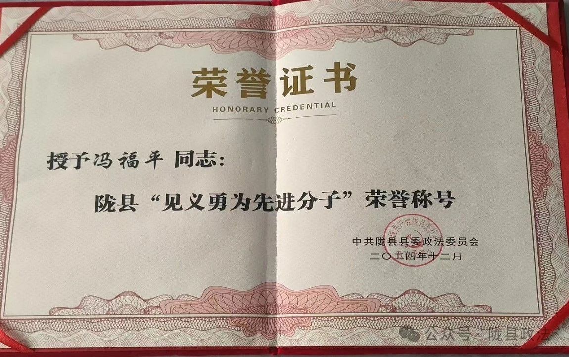 1月2日在全县“一份爱心助见义勇为”公益募集活动总结会上,陇县县委政法委授予冯福平同志“见义勇为先进分子”光荣称号,颁发荣誉证书并奖励5000元。