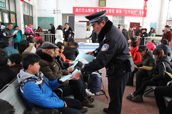 2016年春运已经拉开帷幕。为了确保春运期间辖区安全稳定,为广大旅客营造 “方便出行、安全出行、温馨出行”的乘车环境,结合春运期间客流量大及当前严峻的反恐防暴形式,西安铁路公安处陇县站派出所启动春运安保勤务模式,确保人民群众安全出行。 1月27日,我县组织开展春运安全机制宣传活动。铁路公安民警携带搜爆犬对陇县车站广场及候车室进行安全巡防和检查,并对乘车旅客进行安全宣讲。此次宣传活动中以案施教,主要以现场模拟、实物讲解、发放资料、悬挂标语等传统宣传方式开展。重点对购票、进站、候车和乘车四个容易发生问题的环节进行宣传提醒,切实增强出行乘客群众的自我安全防范意识,最大限度地保护人民群众的生命财产安全。 通过此次宣传活动,提高了旅客的防盗防骗意识,真正将“安全出行、方便出行、温馨出行”落到实处,为旅客创造了一个良好的春运出行环境,得到了广大旅客的一致好评。