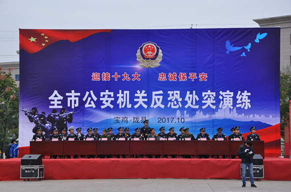 10月11日,全市公安机关反恐处突演练在我县隆重举行。副市长、市公安局党委书记、局长贺东出席活动并作重要讲话,县委书记杜长生出席并致辞,市局党委委员、主持日常工作的副局长陈双琪主持演练活动,市局党委委员、副局长戴永慧,武警宝鸡市支队、宝鸡消防支队、市局治安支队、巡警支队、交警支队以及各县区公安(分)局主要负责同志出席活动。