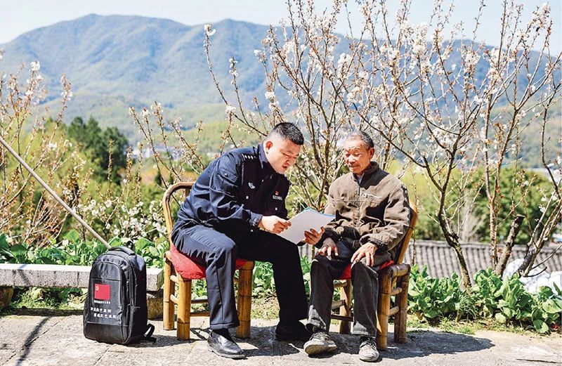 (近年来,各地公安机关践行新时代“枫桥经验”,创新开展“背包警务”等工作模式,为基层群众排忧解难,推动矛盾纠纷化解。图为2025年3月21日,浙江省余姚市公安局梁弄派出所民警通过“背包警务”进村入户,开展安全防范宣传。 新华社记者 江汉/摄)