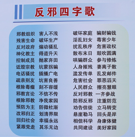 从10月15开始,我县在西门口广场开展了为期一周的平安建设集中宣传活动。各单位都把反邪教警示教育宣传作为本次活动的一个重要内容,和平安建设宣传进行。