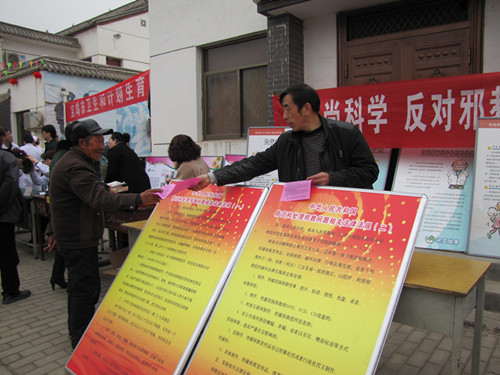 3月17日,宝鸡市第二十三届“科技之春”宣传月暨文化科技卫生“三下乡”综合示范活动在陇县温水镇团结村举行,我县紧抓机遇,在活动现场围绕“崇尚科学 反对邪教”开展了警示教育宣传活动。活动中,共展出《揭穿邪教“全能神”》和《招远血案的罪魁祸首——邪教“全能神”》等25个专题版面,发放反邪教书籍《较量正在进行》50本,反邪教知识宣传单1000余张。此次送反邪教知识下乡活动受到基层群众的热烈欢迎,对于群众了解邪教知识,认清邪教危害,树立防邪反邪自觉意识起到了积极作用,受教育群众达1000余人。